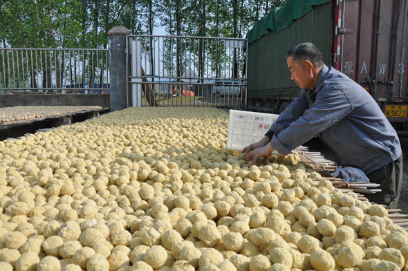 练集镇闫桥村以变蛋加工闻名全市。该村有30多个变蛋加工厂,带动周边多个行政村通过变蛋加工实现致富增收。去年,该村加工变蛋3600多万个,通过电商平台远销省内外。图为4月28日上午,该村勇创变蛋加工厂技术人员在查看变蛋晾晒情况。