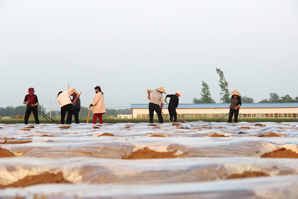4月27日,留守妇女钟点工在商水县郝岗镇东洄村刘双翼的烟叶示范田中移栽、管理烟苗。郝岗镇把烟叶生产作为扶贫产业来抓,在帮助种烟大户流转土地的同时,推广优质品种栽植、节水灌溉新技术,提高烟叶品质,增加烟农收入。