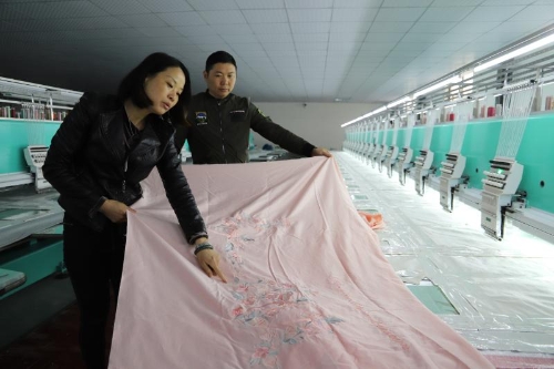 同时,城郊乡发挥基层党员干部和在外创业成功人士的广泛人脉资源和经济优势,引导社会投资发展产业助力脱贫攻坚。谷集行政村美纺科技有限公司就是典型个例。石永红、石永华、石磊姐弟3人来自江苏南通,他们盯上了城郊乡的富余劳动力,投资800万元建设了近2000平方米的纺绣车间,20台国内先进设备可以利用全电脑操作绣出12种颜色的绣品。车间固定用工34人,其中建档立卡贫困户2人。只需要看着电脑控制台、换布贴布、穿针引线,每人每天工资便可达到150元。