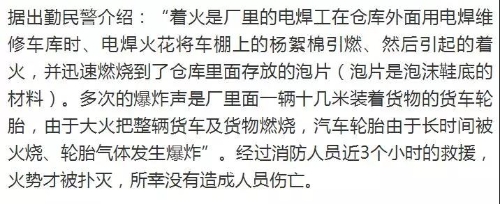 5月8日下午5时许,项城市秣陵镇小学附近,信德鞋材厂发生火灾,火势非常凶猛、现场浓烟滚滚。记者从相关部门获悉,起火原因是电焊火花将车棚上的杨絮棉引燃,导致仓库发生火灾。