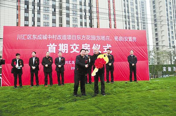 据介绍,东成城中村改造项目是2014年豫港经贸洽谈会重点签约的5个项目之一,是省、市重点棚户区改造项目,涉及川汇区、市经济开发区2个办事处3个行政村,总占地4300多亩。当天交付的东方花园安置房是东杨庄、杨庙安置区项目。该项目占地102.7亩,总建筑面积23.6万平方米,总投资6.52亿元,建设安置房2010套,同时配建幼儿园1所、地下地上车位1600个、社区及商业服务用房1.8万平方米。该项目于2016年10月26日正式开工建设,经过30个月的紧张施工,其中1栋楼208套房达到交付条件,正式交付回迁群众。预计7月1日,该项目将再交付6栋楼1112套房,明年5月整个安置区将全部交工。