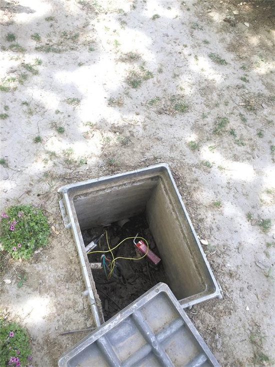 5月14日上午,记者就市民反映的问题到周口公园进行走访。记者发现,公园里大部分地方都干净整洁,但在一些偏僻的地方,有游客随意扔的矿泉水瓶和食品包装袋。在一些地方,有的用于覆盖水管和电线的水泥挡板被掀开,里面的电线暴露在外(图二),存在很大的安全隐患。“这些挡板有的是工作人员为了给园内的花草浇水掀开的,没有及时盖上;有的是游客为了取水掀开的。”周口公园一名管理人员告诉记者。