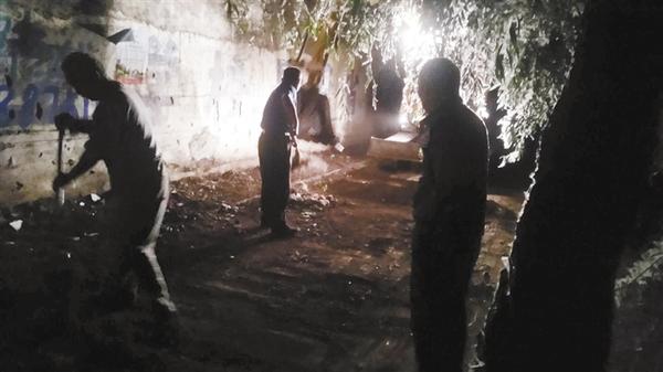 5月12日,荷花路办事处西杨庄社区工作人员挑灯夜战,加班清理黄金桥干渠两侧居民私开小菜园。