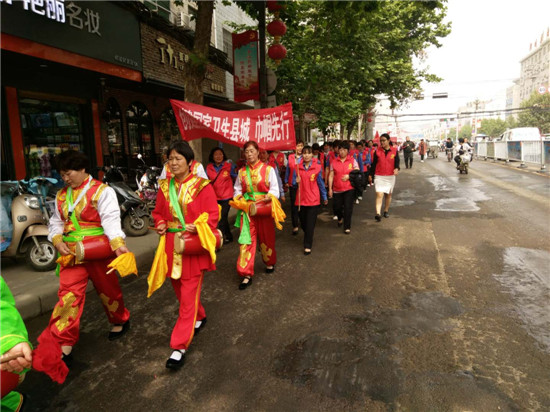 启动仪式结束后,志愿者们按照预定路线沿县城主街道以发放宣传彩页、齐喊口号、挑起横幅等形式开展宣传活动。