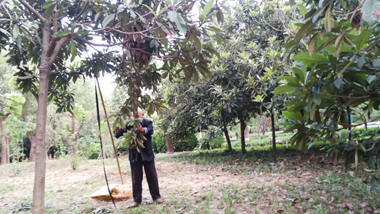 5月20日早上,在周口中心城区文昌大道与府苑街交叉口西侧的街头小游园内,一位老人正在采摘枇杷树上还未完全成熟的枇杷果。记者看到,老人已采摘了一些枇杷果,地上落了不少树叶。