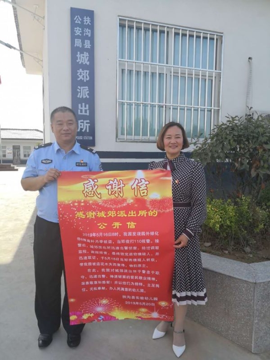 5月20日上午,扶沟县实验幼儿园把一封感谢信送到城郊派出所民警手中,表达对该所民警迅速出警,快速办案的敬意和谢意。