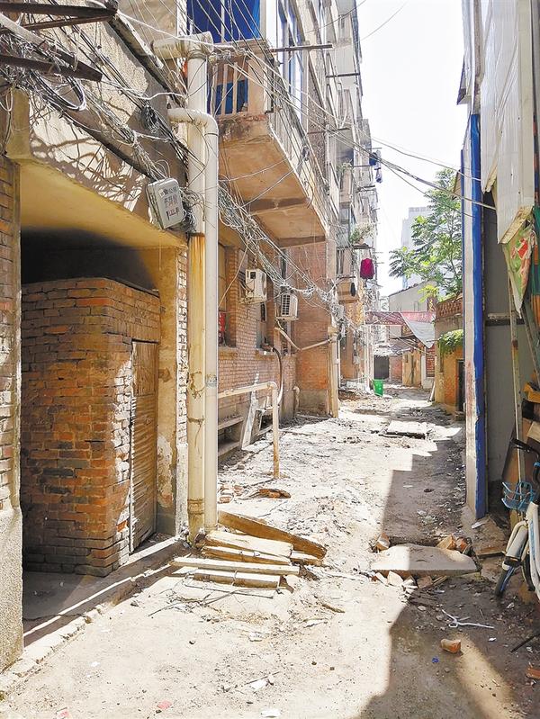 5月23日上午,记者来到市民反映的楼院,发现现场情况确实和市民反映相同。该楼院的过道上全是破碎砖块和建筑垃圾,一些管道裸露在单元入口外,地上的窨井盖用破木板遮挡,过道的两侧还有一些拆迁留下的废旧物,过道的上面是凌乱的电线和破旧广告牌。