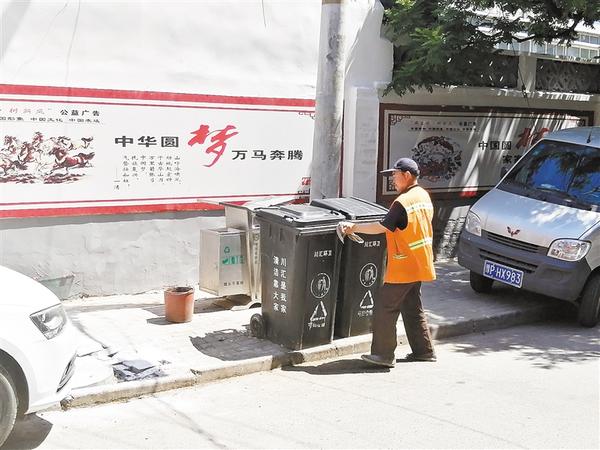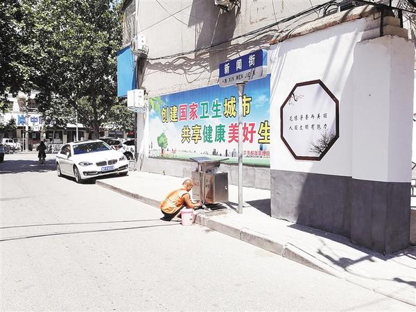 5月23日中午,在周口市中心城区新闻街上,一桶水一块抹布,多位环卫工人顶着烈日,用抹布将一个个垃圾箱擦拭干净(如图)。路边接孩子放学的市民表示,希望大家珍惜环卫工人的劳动成果,周口“创卫”人人有责。 记者 牛思光 摄