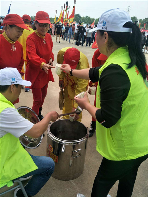 由于龙舟赛观众分布在沙颍河的南北两岸,为了让南北两岸的观众都能喝上绿豆茶,周口萤火虫公益的志愿者特意在南北两岸各放置一个盛装绿豆茶的保温桶,还派有专门的志愿者为大家服务。