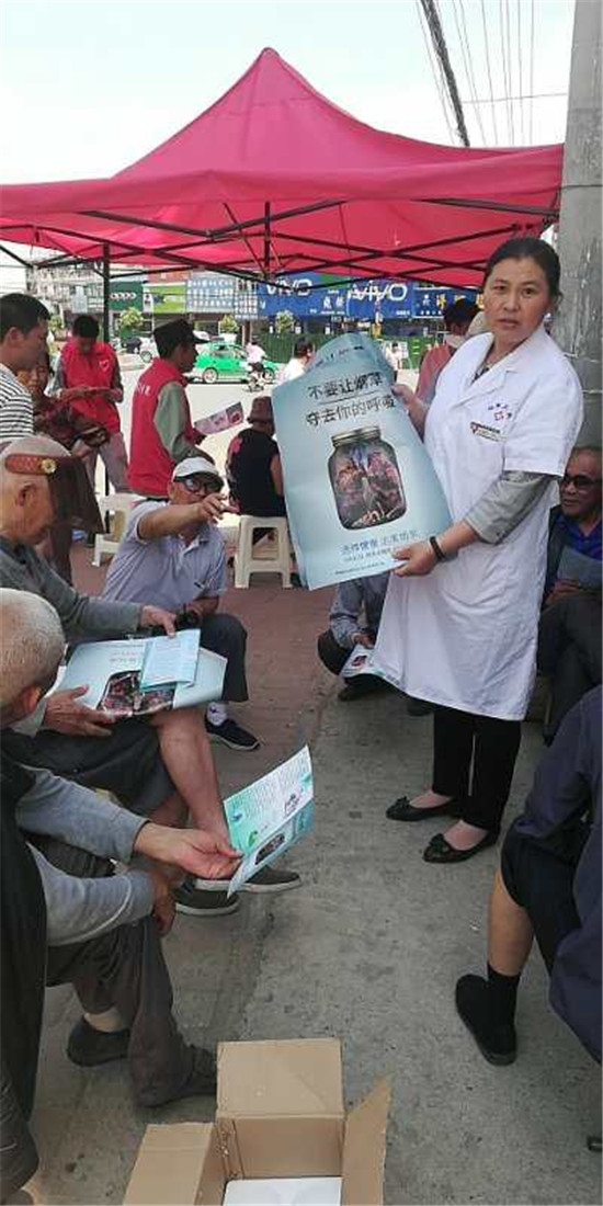 该县疾控中心组织8名工作人员,在支农路北段以悬挂宣传主题横幅、摆放宣传展板、设立义诊咨询台、发放宣传资料等形式,向过往市民宣传吸烟可导致肺部损伤和增加高血压风险等危害,以及戒烟的方法等知识,引导大家远离烟草,养成健康、文明的生活方式。