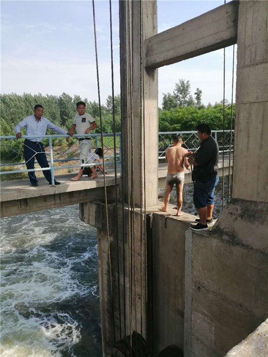 顺着喊声方向,他跑到河闸边,发现一男子骑在距水面约半米的闸门上,侧身弯腰拉着一在水中挣扎的女青年。河面很宽,从上流奔腾而下的水汇集到闸门前,由于河道变窄流得很急。女青年的一只手被男子牢牢拉住,身体在深4米多的水中四处晃摆。男子体力消耗很大,有点坚持不住,不住地抬头呼救。
