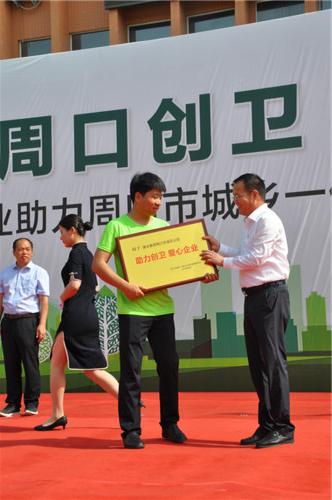 城乡一体化示范区管委会主任张建党代表示范区党工委、管委会现场为周口建业颁发“助力创卫爱心企业”奖牌。