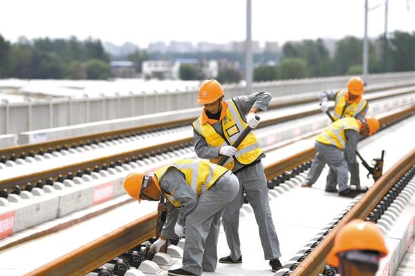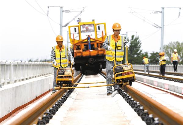 6月11日,中铁一局新运公司施工人员在进行铺轨作业。