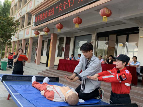 活动现场,消防教官为同学们讲解了防火安全的重要性,火灾的预防和救助,演示了灭火器的使用方法;西华县红十字会救护师耿佳佳、姚华杰二人为同学们现场生动讲解演示“珍爱生命、预防溺水”的生动安全教育课,让同学了解溺水的危害性,做好有效预防溺水的重要性,演示发生溺水怎么办及对溺水者如何做胸外心脏按压,同学们认真聆听和学习,学会了判断呼吸心跳停止、按压手法、按压位置、打开气道方法、判断呼吸心跳是否恢复等急救技能。同学还掌握了溺水急救基本标准:打开气道、人工呼吸、胸外按压。