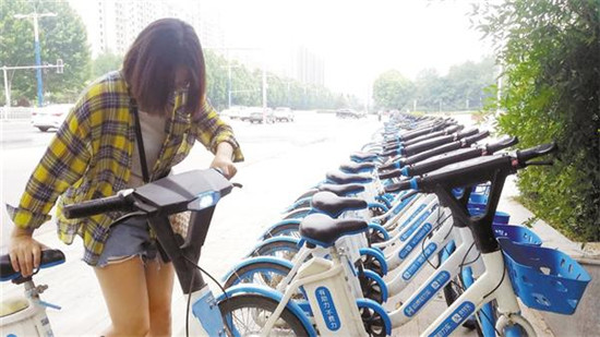 6月19日,一位市民在周口师范学院南门扫单车出行。
