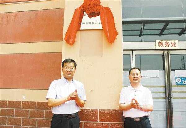 最后,徐久成、白子兴共同为河南师范大学教师教育实习基地揭牌(如图)。揭牌仪式结束后,双方代表共同签署了合作协议,正式建立了合作关系。