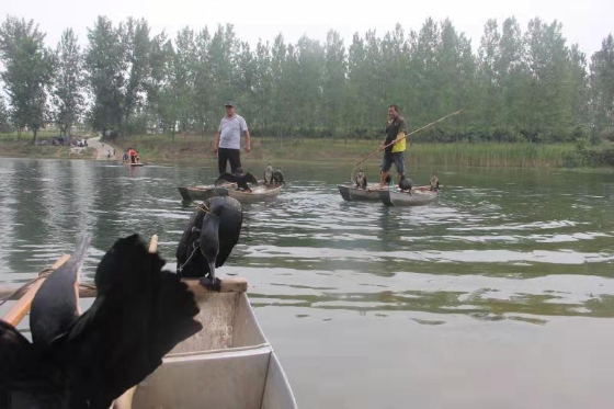 悄悄地,渔船轻移,飘至河心。船家一声令下,鸬鹚箭一般窜入河中,或扑棱翅膀,搏击水面,或紧追游鱼,衔进口中。采风团成员,紧盯鸬鹚衔鱼,快按镜头,收获一张张丰收画面。