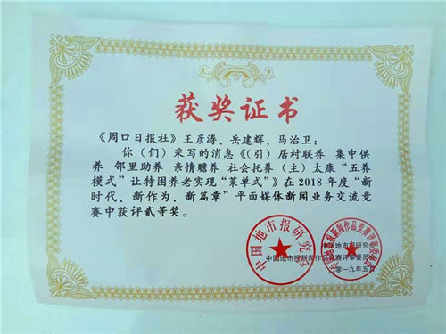 中国地市报新闻奖评选活动由中国地市报研究会主办,每年举办一次,在全国有着广泛的影响,此项新闻奖评选活动涉及全国几乎所有地市党报,不仅是展示地市党报形象的重要舞台,也是衡量地市党报办报水平的重要标志,同时也是以新闻的形式展示各地亮点工作的重要。《太康“五养模式”让特困养老实现“菜单式”》稿件在此项新闻奖评选中,同样表现不凡,最终荣获中国地市报新闻奖二等奖。