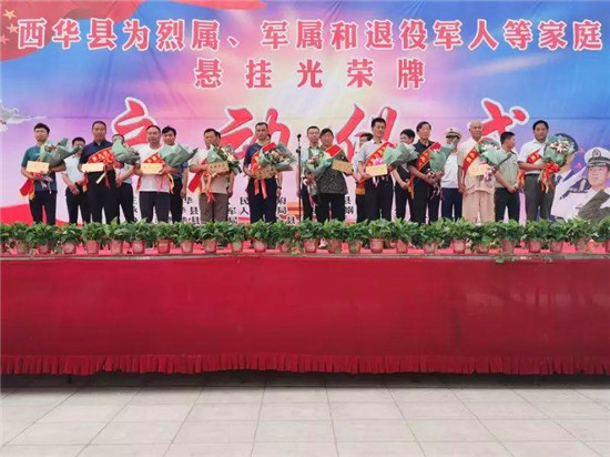 “八一”建军节前夕,西华县启动了军人军烈属悬挂光荣牌仪式、2019年义务兵家庭优待金发放仪式。营造“一人当兵、全家光荣”的良好氛围,共同巩固人民军队的“钢铁长城”。