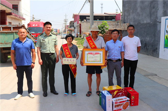 县人武部、退役军人事务局、双拥办等相关单位,通力协作,深入全县465个行政村(居委会),为军人军烈属发放光荣牌、义务兵家庭优待金发放。截至目前,全县23000多“军人军烈属光荣牌”,已经发放到户到人。在“军人军烈属光荣牌”发放中,奉母镇奉三村现役军人李中州荣立二等功,县人武部、退役军人事务局、双拥办组织到李中州家挂光荣牌并送喜报,看望慰问李中州的父母。李中州的父亲说:“中州在部队已服役20多年,曾多次获得三等功,这次又荣获二等功,这是党和军队培养的结果。今天县领导来家慰问我们,感谢党和政府对我家的关心照顾,我们将嘱咐孩子努力工作,为军队事业再做贡献,为家乡争光添彩。”