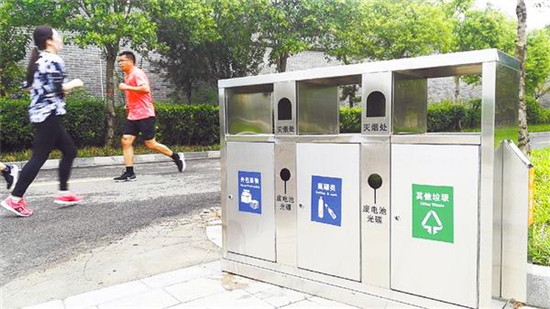 7月18日7时许,晨练的市民从周口公园安装不久的新型分类垃圾桶旁跑过。
