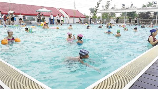 7月21日下午,孩子们在中心城区一室外游泳池里学习游泳,或戏水玩耍。