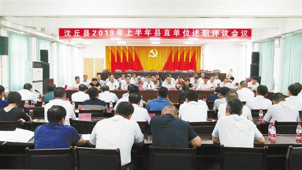 本报讯 (记者 韦伟 文/图) 7月19日,沈丘县召开2019年上半年县直单位述职评议会议(如图)。皇甫立新、刘国庆、贾庆伟、殷晓春、李子顺、赵振、郭宇、马伟、夏立文、李明朗等在家的县四个班子领导及副处级以上干部出席会议。县委各部委常务副职,27个县直单位负责人,部分人大代表、政协委员参加会议。