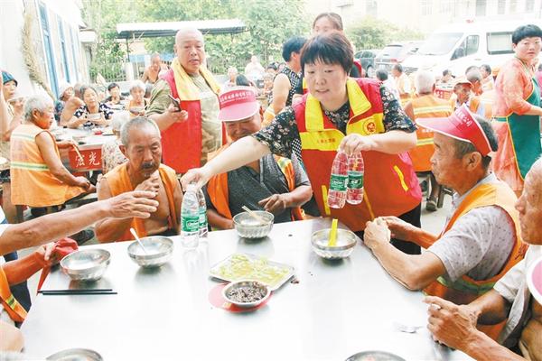 为帮助环卫工做好防暑降温工作,7月23日,太康县总工会到该县“爱心粥屋”看望慰问环卫工人,并捐赠1万元现金和价值6000元的毛巾、矿泉水。图为该县总工会志愿者为环卫工发放矿泉水。