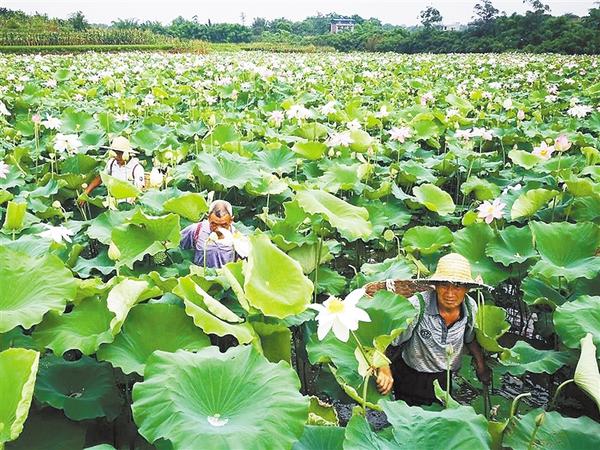 盛夏时节,沈丘县卞路口乡南郭庄村400亩荷塘里的莲蓬成熟,荷塘里一片繁忙景象。近年来,该村因地制宜,种植莲藕,让村民增收不少。