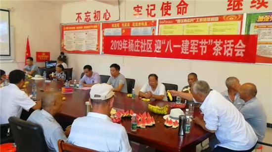 7月27日,在王一博、赵玉超同志的带领下,办事处全体班子成员带领驻村干部带着慰问品和慰问金,到各自分包社区开展走访慰问活动,在不漏一户、不落一人的慰问要求下,全体干部不畏酷暑,把党和政府的关怀及时送到退役军人家中。杨庄社区94岁的退役军人杨计得退伍后,热心公益事业,朴实纯粹、淡薄名利,慰问结束后,他紧紧拉住办事处干部的手饱含热泪,动情地说:感谢共产党,感谢党和政府的关怀,现在县里发展那么好,如果再年轻十岁,我还为社区发展贡献自己的力量。