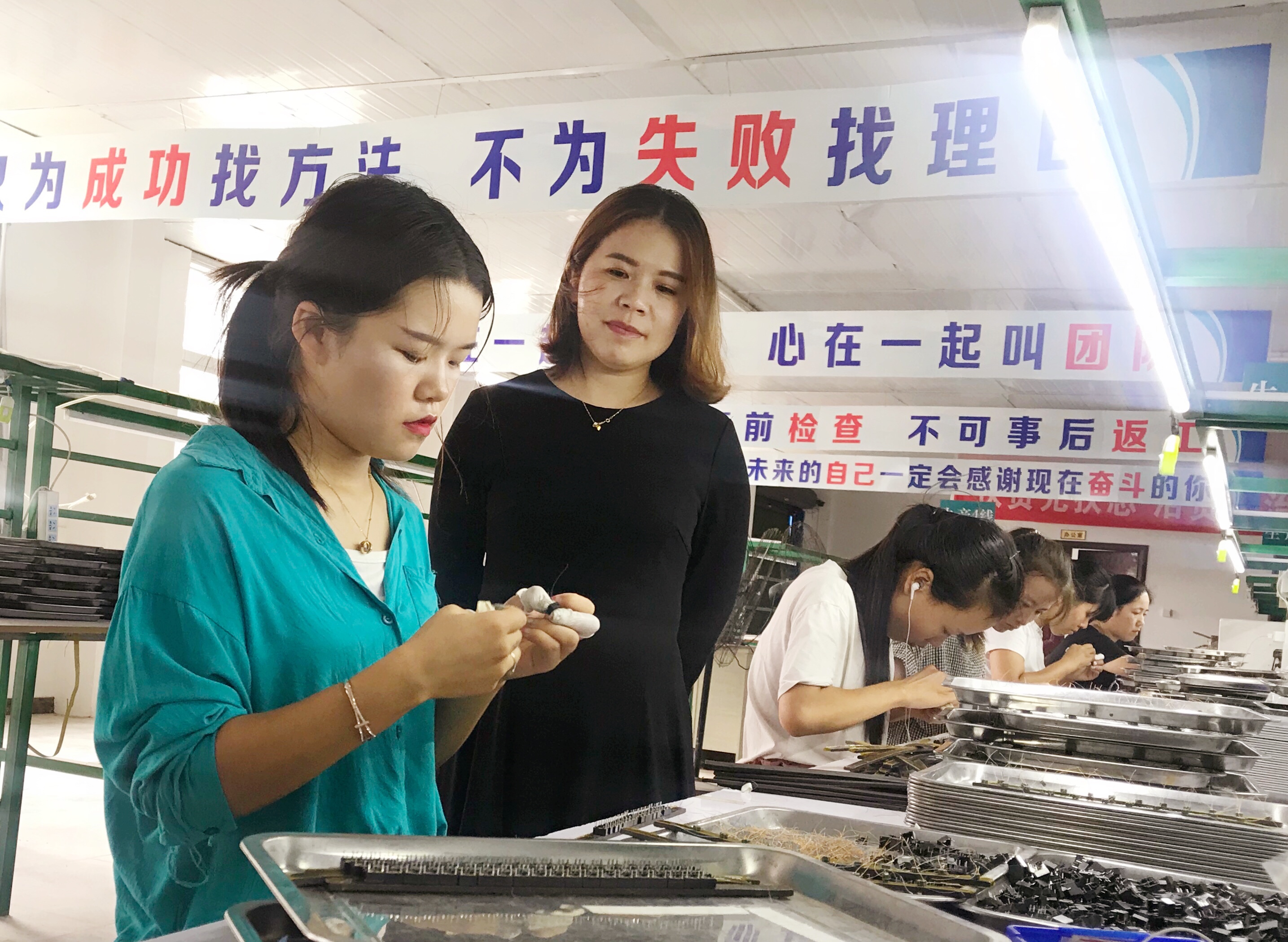 河南双晨电子科技有限公司去年落户西华县大王庄乡刘老家村后,生产线安装绕线机、点焊机、包装机等近50台,产品广泛用于液晶显示屏、计算机、数码相机、医疗设备、汽车等,目前已安置群众就业50余人,其中贫困户近20人,人月均收入3000多元,让村民在家门口实现就业增收。图为该公司总经理在生产车间了解工人收入和家庭生活情况。