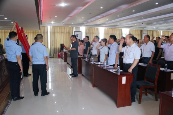 在庄严雄壮的《国歌》声中,新任150名人民陪审员在王洪彬院长的带领下,面向国旗,举起右臂,铿锵有力地作出了神圣而庄严的宣誓。
