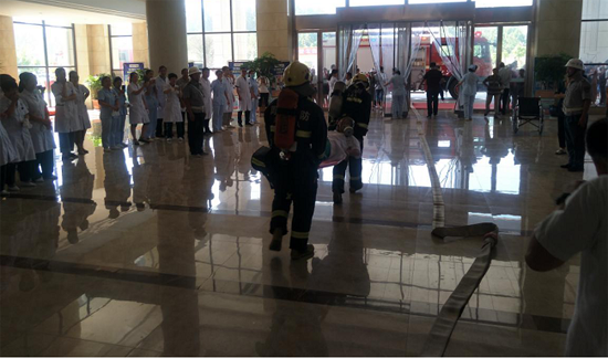 此次演练模拟一个蒙面歹徒在该县六楼某科室打砸并故意纵火,辖区公安干警、消防指战员及医院保安力量迅速出动处置,防恐人员及时将犯罪分子制服,而此时医院内火灾迅速蔓延,多名医护人员被困火场无法逃生,医院负责人通过应急广播进行人员疏散,消防指战员按照预定应急处置方案迅速展开灭火救援行动。