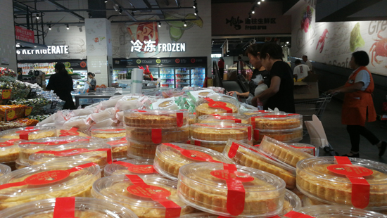 8月26日,市民在中心城区七一路与中州大道交叉口附近的一座大型超市里选购月饼。