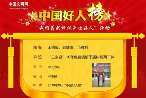 太康县王锦良、郭健康、马胜利在杨庙乡成立幸福调解室,10年调解矛盾两千件,成为各界美谈。9月2日,8月份中国好人榜发布,该县杨庙乡幸福调解室“三乡贤”同时荣登中国好人榜。截至目前,该县入选“中国好人榜”已达60人。