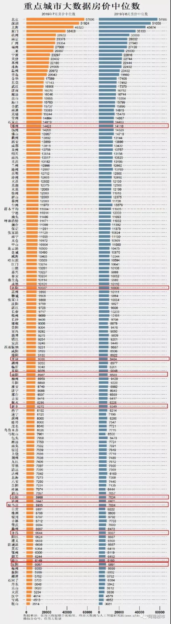 2019年9月2日,住房大数据联合实验室、纬房研究院发布了重点城市2019年7月大数据房价中位数。数据显示,北京、深圳、上海分别以57006、51924、46323元/平方米的单价,居全国城市房价前三位。其中郑州房价中位数为14423元/㎡,在全国范围排名28位,高于西安、成都、长沙等城市,与6月份房价中位数(14118元/㎡)相比上涨305元/㎡。