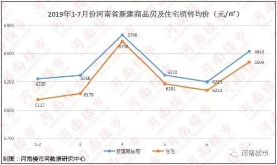 据河南楼市网数据研究中心统计显示,2019上半年河南省商品房及住宅均价呈现先扬后抑的局面,在3月份均达到最高值,分别为6798元/㎡、6730元/㎡,随后房价连续2月出现下滑;然而到了下半年7月份,河南省商品房及住宅均价再次回暖,其中住宅均价为6509元/㎡!