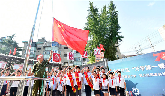 伴着雄壮的国歌声,30多名孩子目不转睛地看着国旗冉冉升起……为迎接新中国成立70周年,近日,江苏省扬州市邗江区双桥街道文苑社区在社区国旗台广场,组织开展了开学第一课“我与国旗合个影、我为祖国添笑脸”活动。鲜艳的五星红旗、灿烂的孩子笑脸,组成了一幅和谐美丽的画面。