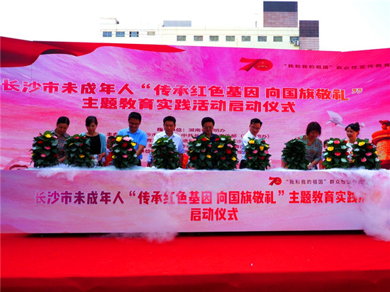 嘉宾们共同浇灌希望之花,启动长沙市未成年人“传承红色基因 向国旗敬礼”主题教育实践活动。