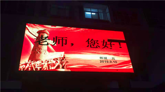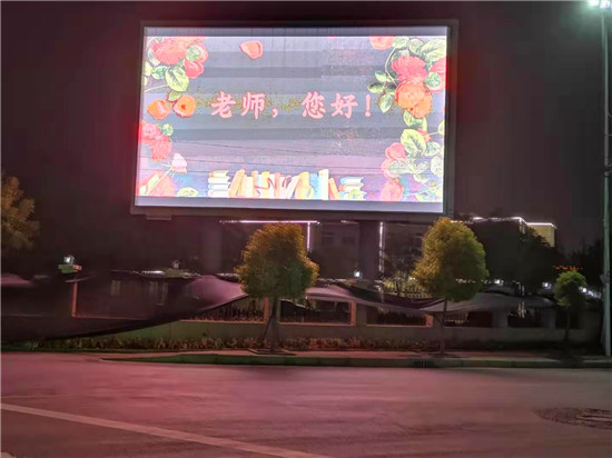“老师,您好!”9 月10日晚上,郸城县人民公园大屏幕上,向全县教师发出了温暖、明亮的祝福。同一时刻,城区各主要街道公共LED大屏幕,以及县一高、三实小等城区学校和石槽一中、秋渠一中等乡村学校的显示屏上,“老师,您好”四个大字在夜幕下显得格外的醒目与亮眼。教师节当夜,老师俨然成为了“夜空中最闪亮的星”。