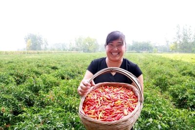 在朱楼行政村,朱高杰、王丽夫妻俩正带领20多名采摘工人在辣椒田里采摘艳红、泡椒两个品种,地头停放着盛满辣椒的三轮车和五六个蛇皮袋,火红的辣椒映衬着小两口脸上灿烂的笑容:“大丰收呀,这块地是泡椒,还没有出地头,就划3.8元一斤了,走向市场至少五六元钱。咱吃的泡椒凤爪、泡椒罐头,都是这做的。像那块地的艳红,就像它的名字一样又红又鲜艳,出地头就得七八块,卖到市场上都10多元一斤,主要卖到四川、湖北等地,这是火锅底料、炒菜的必备品,这是个炒出来有香味的辣椒品种。”王丽能说会道,而且在她的带动下,全乡许多亲朋好友都在种植辣椒。像王丽一样,汲水乡种植辣椒面积突破了1万亩,整个郸城县种植辣椒突破5万亩。