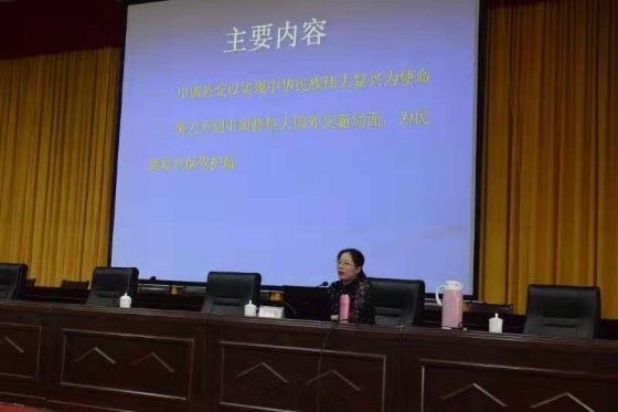姚巧华从“新时代中国外交坚持以实现中华民族伟大复兴为使命”“努力开创中国特色大国外交新局面,为民族复兴保驾护航”两个大方面,深刻阐述了“习近平新时代中国特色社会主义外交思想”。所讲观点鲜明,重点突出,讲法灵活,图文并茂,事例贴切,语言精准,理论性强,具有很强的指导性。