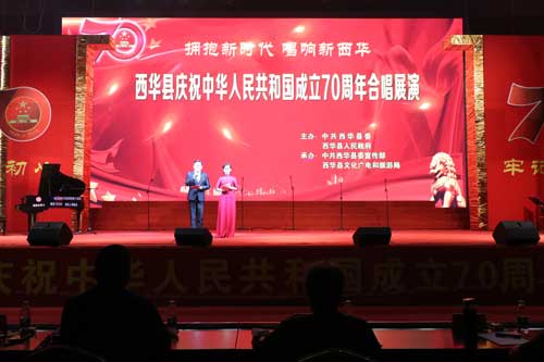 9月23日和24日晚,由西华县委、县政府主办,县委宣传部、县文化广电和旅游局承办的“拥抱新时代·唱响新西华”庆祝中华人民共和国成立70周年合唱展演预赛在该县体育馆举行,林鸿嘉、程维峥、周晓燕、郭峰、陈秉生、杨凤臣、张晓伟、赵增先等县处级领导干部与来自全县各届的群众共同观看演出。