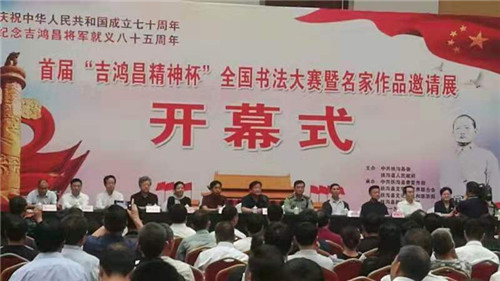 为纪念抗日民族英雄吉鸿昌将军就义85周年,大力弘扬爱国主义精神和中华民族优秀传统文化,9月28日上午,首届“吉鸿昌精神杯”全国书法大赛暨名家作品邀请展在扶沟县体育馆隆重举行。原广州军区政治部副主任陈大民少将、解放军报社原副社长田仁德少将、解放军报社原副总编孙临平少将、解放军装备学院原副政委孙南京少将、解放军总后勤部某研究所原所长杨廷欣少将、吉鸿昌将军亲属郑吉安大校,市委常委、周口军分区政委孙先振,市政协副主席张文平,扶沟县四个班子领导及副处级干部等出席开幕式。县委副书记、政法委书记詹凯主持仪式。