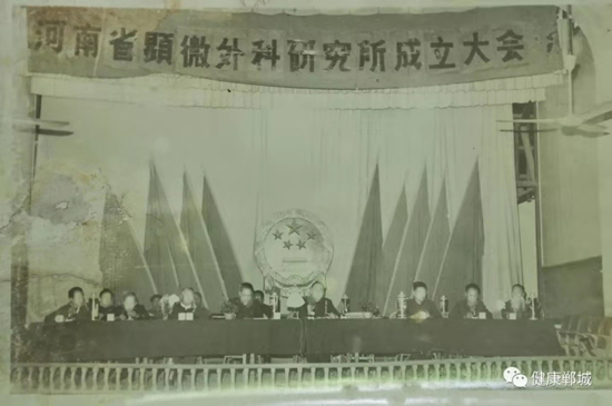 1983年河南省人民政府决定在郸城县建立河南省显微外科研究所(图为成立大会)。1984年省卫生厅拨款58.6万元在医院内建设河南省显微外科研究楼。