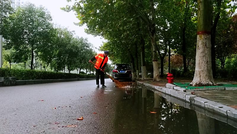 连续几日的阴雨结束后,10月7日一大早,环卫工人们就开始清理中心城区道路上的积水和落叶,为我市“创卫”工作贡献一份力量。