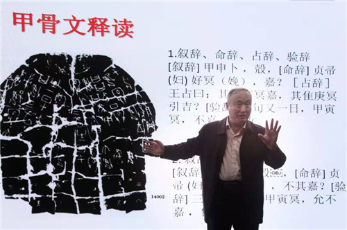 接着,在历时两个半小时的分享中,郝教授以融合发现、甲骨文字拆分、甲骨文书风及甲骨文书法创作为立足点,衬以个人习书作品,从文化本义的内涵、文化本义的要素、文化的生成和甲骨文的演化和发展等方面详细阐述了文化的来源以及人类社会进步的过程。