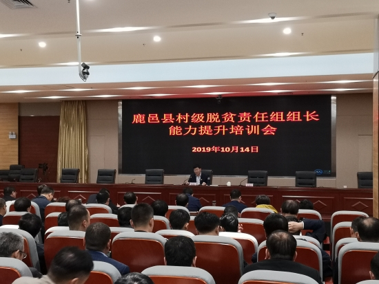10月14日,鹿邑县村级脱贫责任组组长能力提升培训会召开。县领导梁建松、许四军、李国际、雷申、韩林、侯自峰、王晓征、张国庆等出席培训会。会议号召与会人员要以“不忘初心、牢记使命”的责任担当,将问题整改做为主题教育的重要抓手,坚决打赢打好脱贫攻坚“百日会战”。