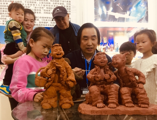 在文博会周口主题展馆,郸城著名泥塑艺术大师张振福现场制作泥人儿。不到20分钟,一件“豫东娃”的作品就捏了出来,吸引了众多游客前来观看,赞叹不已(如图)。鹤壁广播电视台直播了张振福捏泥人儿的过程。此次文博会张振福共展出泥塑作品50件,其中泥人儿30件、钧瓷泥塑20件。