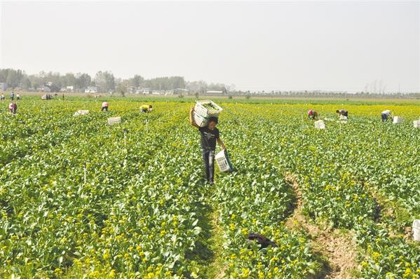 10月30日,商水县大武乡金陆蔬菜种植合作社菜农在采摘今年第二茬菜心。今年秋季,该合作社种植菜心近2000亩,长势良好,首茬2万多公斤菜心发往深圳、香港后,市场反映很好,深受市民喜爱,价格也高于往年。记者 付永奇 摄